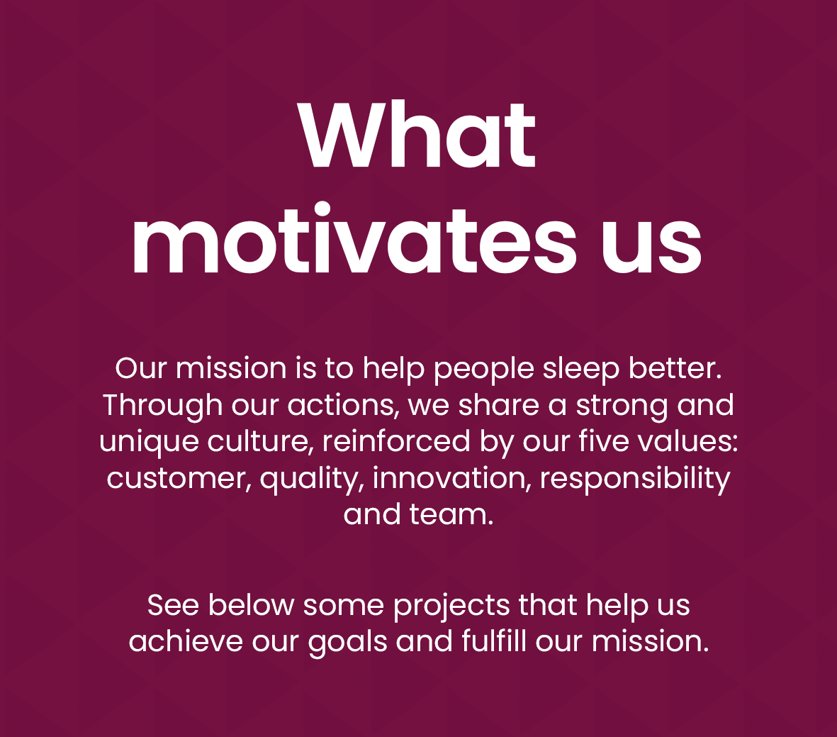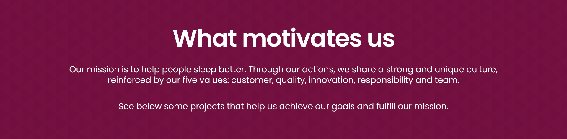 We are passionate about deep sleep, comfort and well-being. More than that, we understand that resting and sleeping well is essential for our health. The technology and comfort of our products reflect our constant search for the quality of life of each customer.
