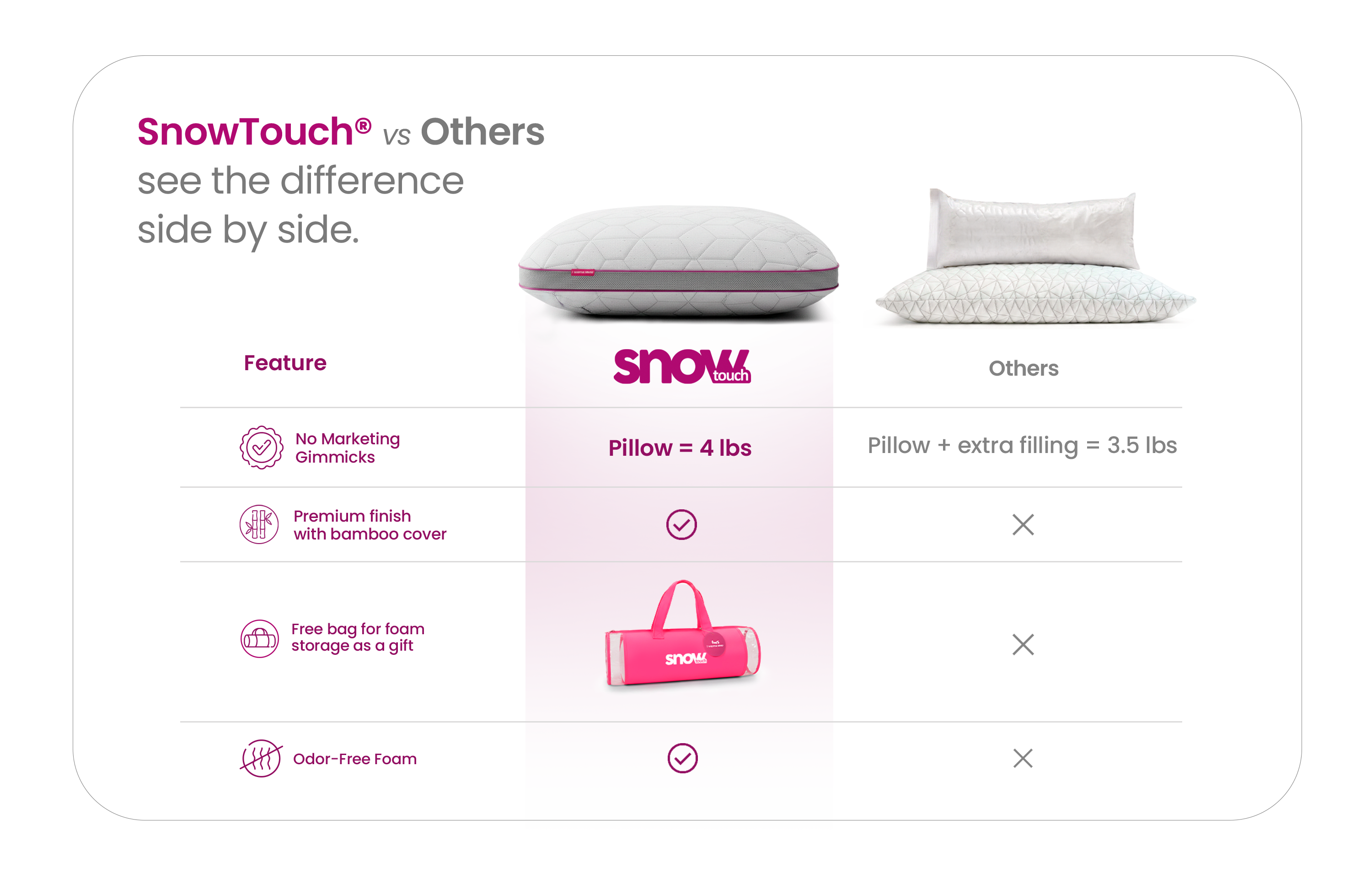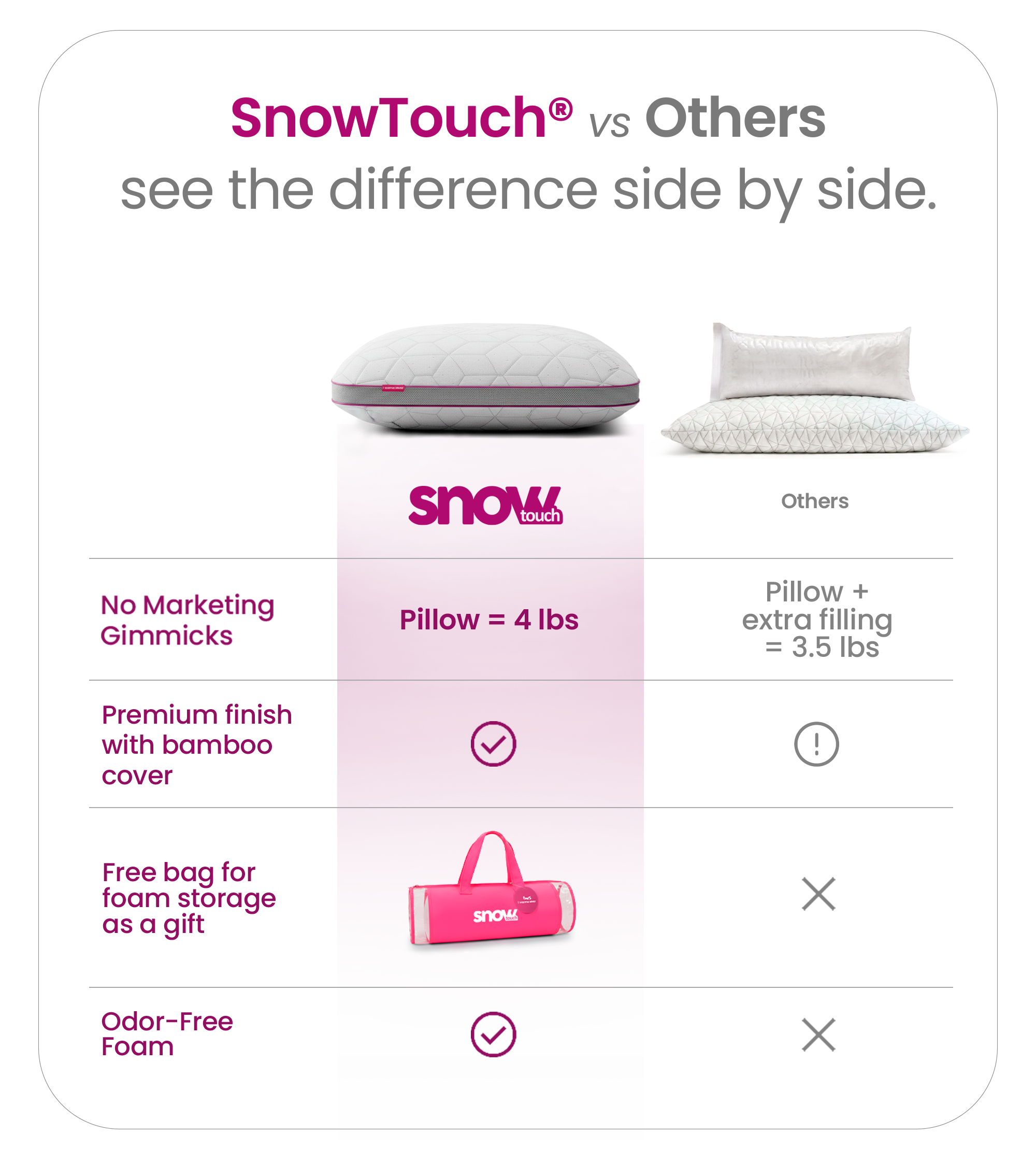 Snowtouch delivers complete support from the start. Others gives you less pillow and extra stuffing.