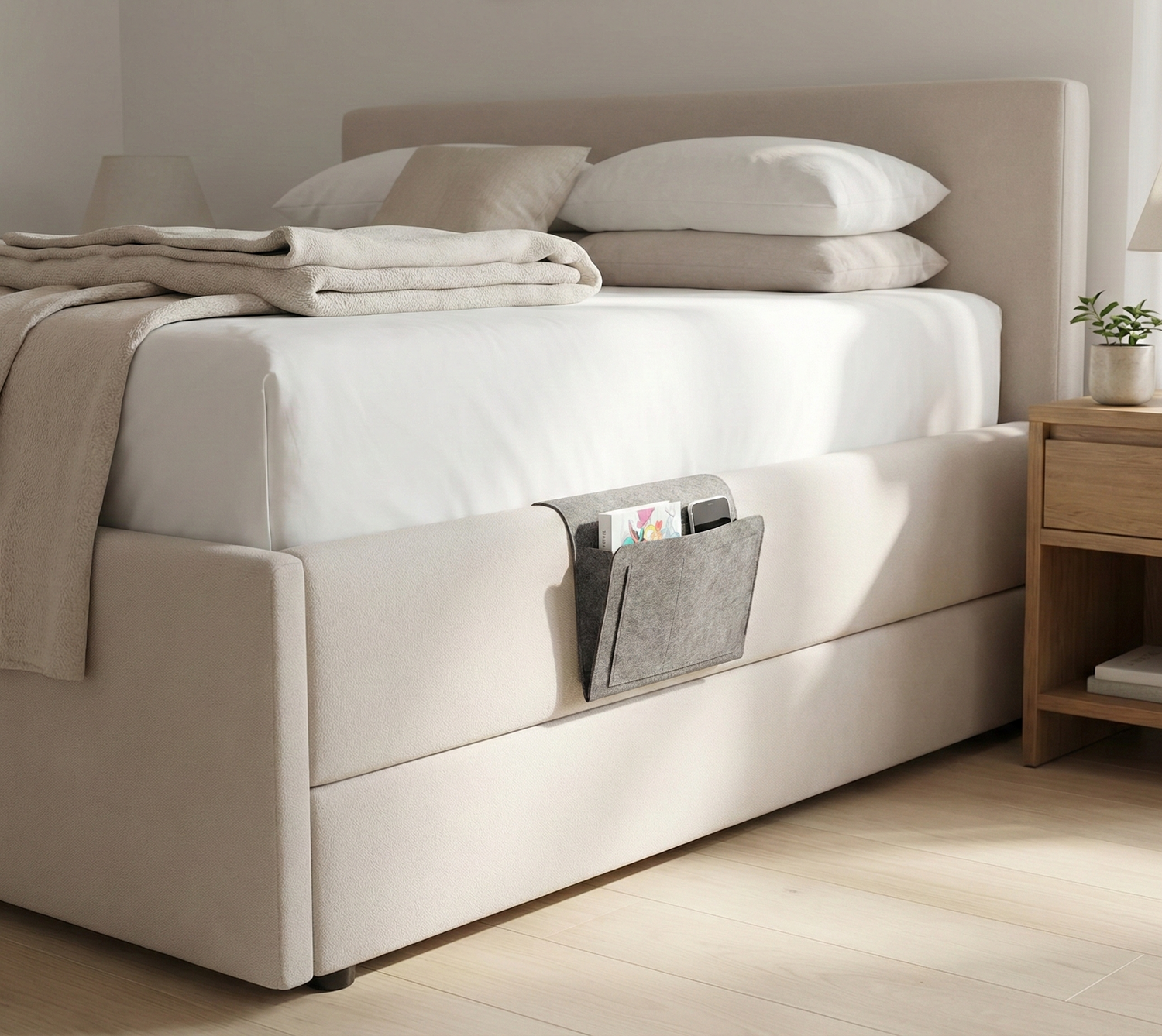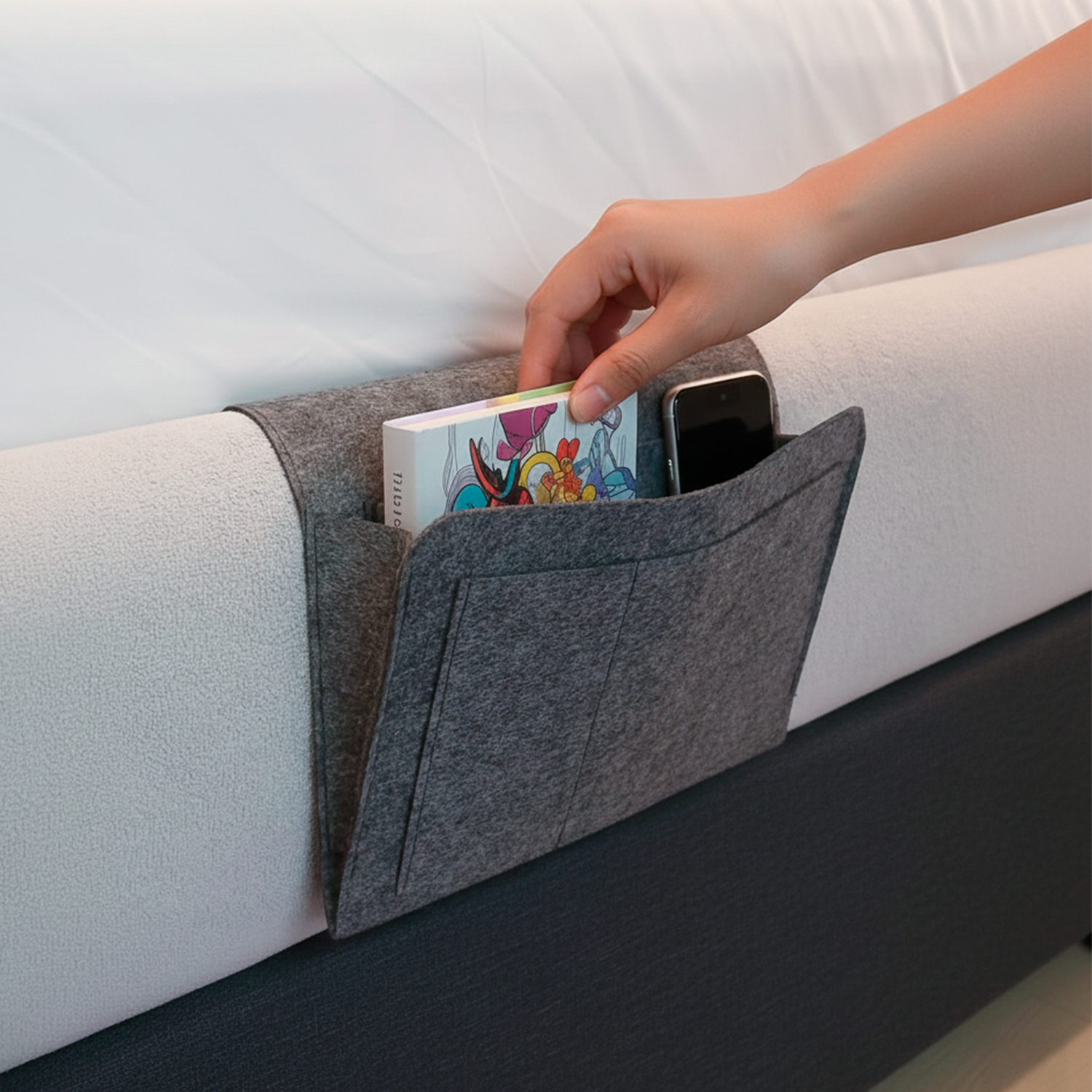Designed to keep your essentials within reach, Bedsac™ fits discreetly between the mattress and headboard, offering practical storage without taking up extra space. Its durable felt design helps reduce clutter and adds everyday convenience to your nightly routine.